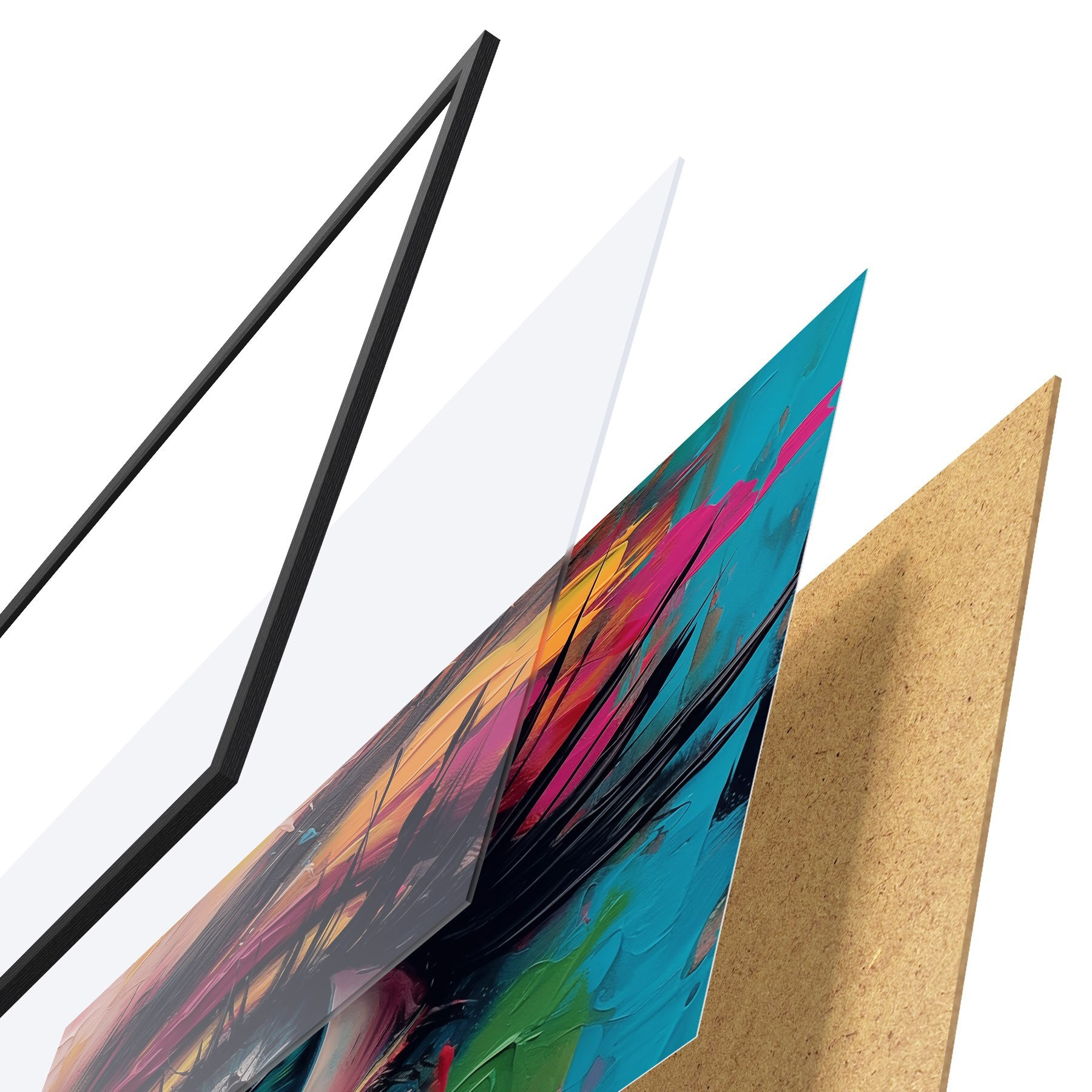 Plakát se skládá z rámu, plexiskla, tištěného obrazu a dřevotřískového podkladu. Díky úchytům na zadní straně lze plakát ihned zavěsit na zeď.