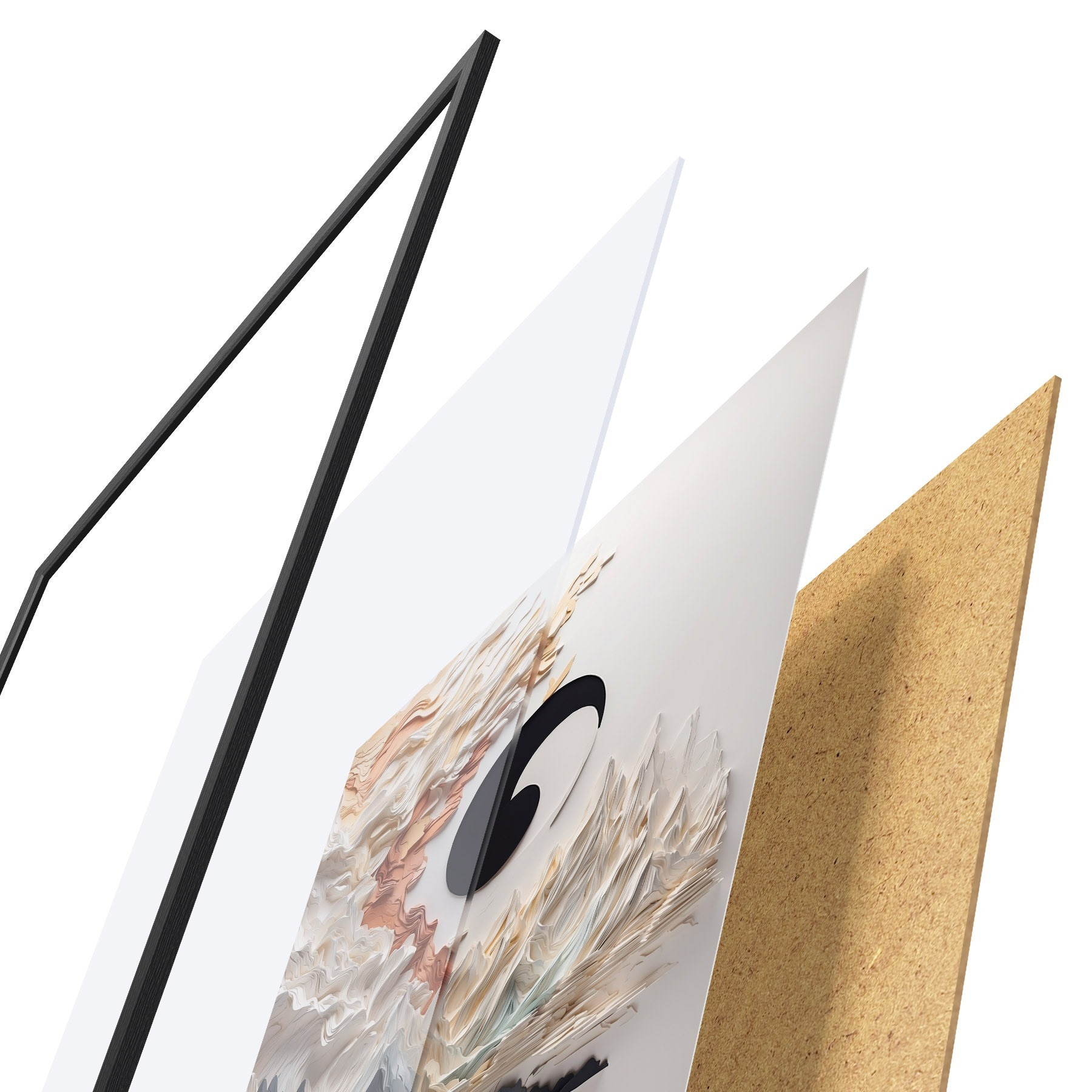 Plakát se skládá z rámu, plexiskla, tištěného obrazu a dřevotřískového podkladu. Díky úchytům na zadní straně lze plakát ihned zavěsit na zeď.