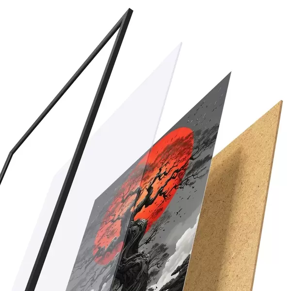 Plakát se skládá z rámu, plexiskla, tištěného obrazu a dřevotřískového podkladu. Díky úchytům na zadní straně lze plakát ihned zavěsit na zeď.