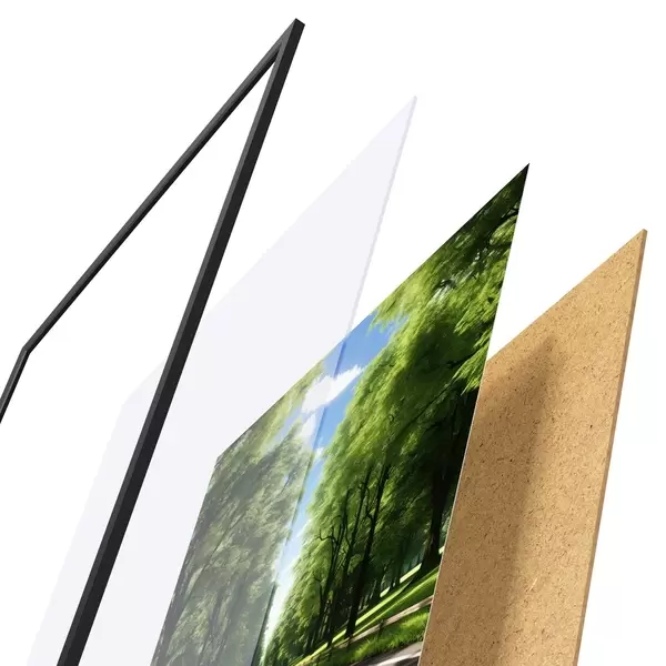 Plakát se skládá z rámu, plexiskla, tištěného obrazu a dřevotřískového podkladu. Díky úchytům na zadní straně lze plakát ihned zavěsit na zeď.