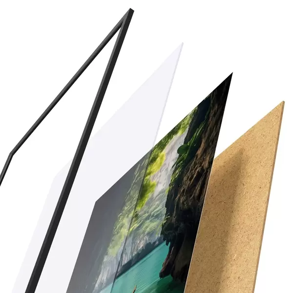 Plakát se skládá z rámu, plexiskla, tištěného obrazu a dřevotřískového podkladu. Díky úchytům na zadní straně lze plakát ihned zavěsit na zeď.