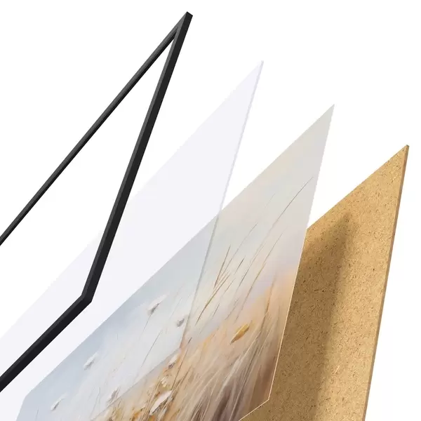 Plakát se skládá z rámu, plexiskla, tištěného obrazu a dřevotřískového podkladu. Díky úchytům na zadní straně lze plakát ihned zavěsit na zeď.