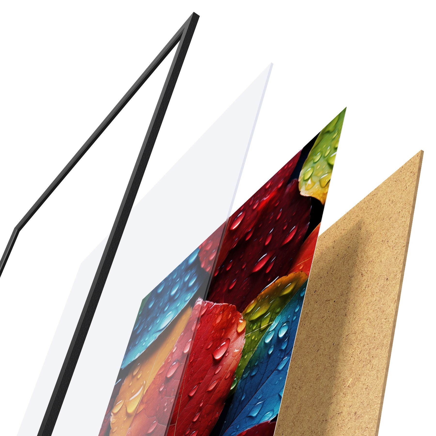 Plakát se skládá z rámu, plexiskla, tištěného obrazu a dřevotřískového podkladu. Díky úchytům na zadní straně lze plakát ihned zavěsit na zeď.