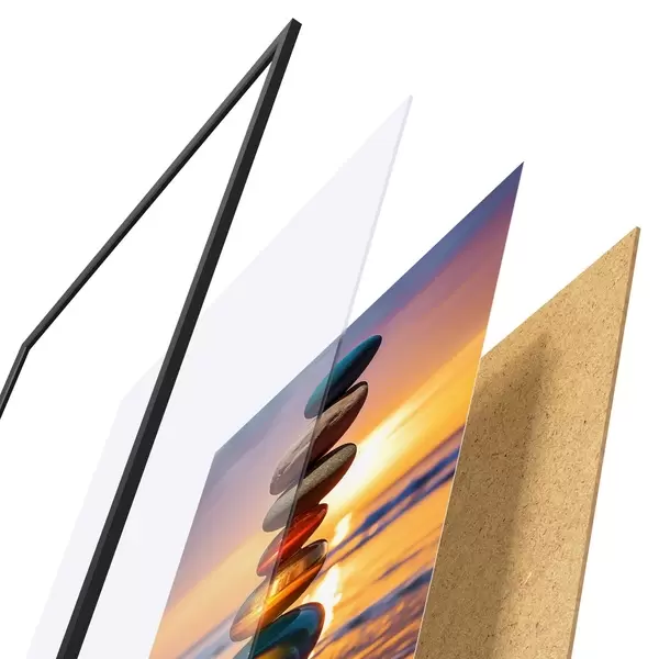 Plakát se skládá z rámu, plexiskla, tištěného obrazu a dřevotřískového podkladu. Díky úchytům na zadní straně lze plakát ihned zavěsit na zeď.