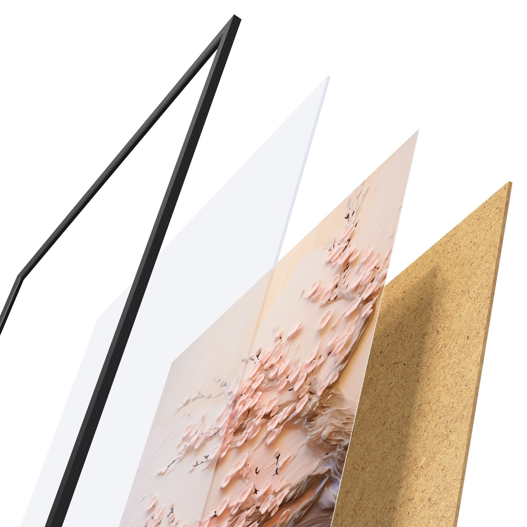 Plakát se skládá z rámu, plexiskla, tištěného obrazu a dřevotřískového podkladu. Díky úchytům na zadní straně lze plakát ihned zavěsit na zeď.