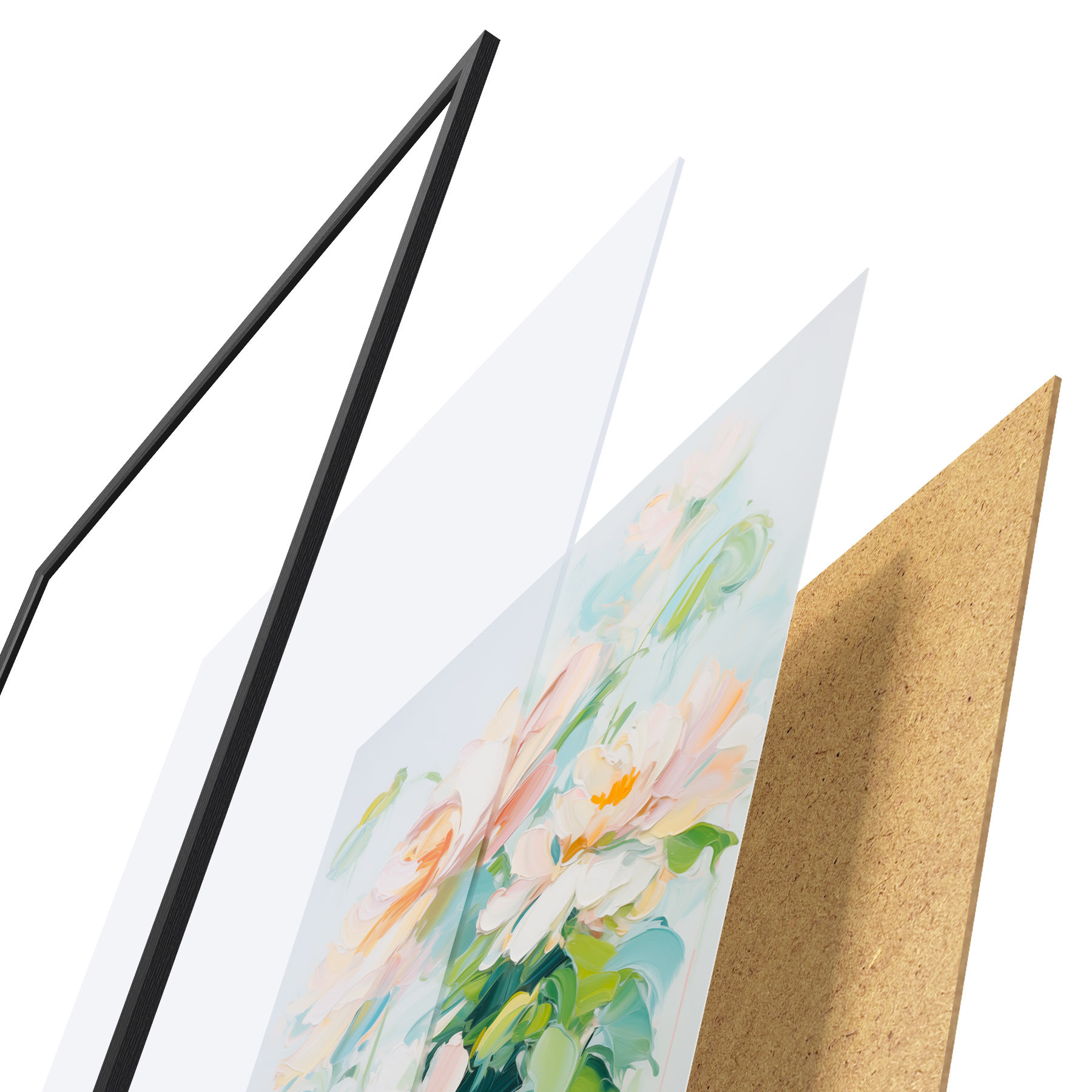 Plakát se skládá z rámu, plexiskla, tištěného obrazu a dřevotřískového podkladu. Díky úchytům na zadní straně lze plakát ihned zavěsit na zeď.
