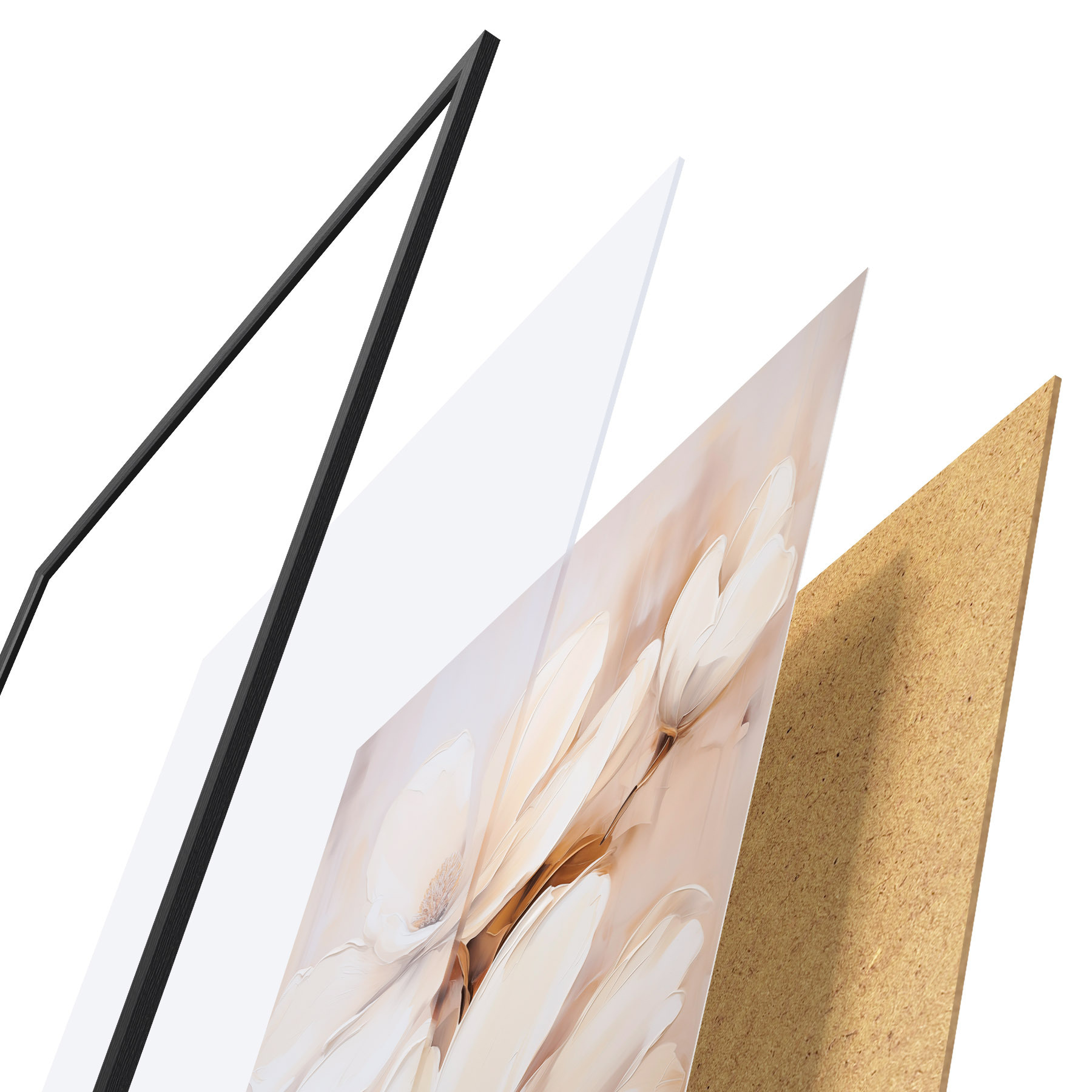 Plakát se skládá z rámu, plexiskla, tištěného obrazu a dřevotřískového podkladu. Díky úchytům na zadní straně lze plakát ihned zavěsit na zeď.
