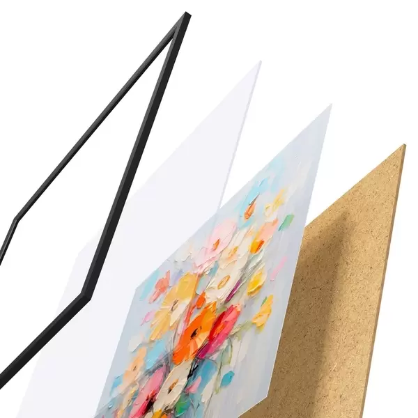 Plakát se skládá z rámu, plexiskla, tištěného obrazu a dřevotřískového podkladu. Díky úchytům na zadní straně lze plakát ihned zavěsit na zeď.
