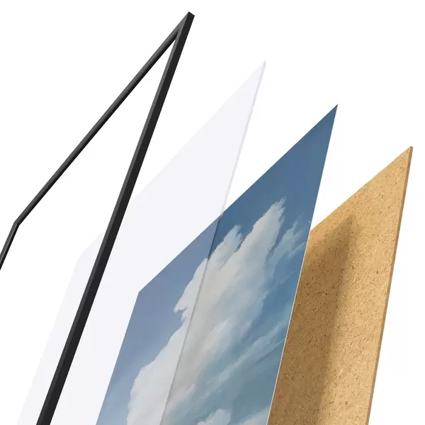 Plakát se skládá z rámu, plexiskla, tištěného obrazu a dřevotřískového podkladu. Díky úchytům na zadní straně lze plakát ihned zavěsit na zeď.