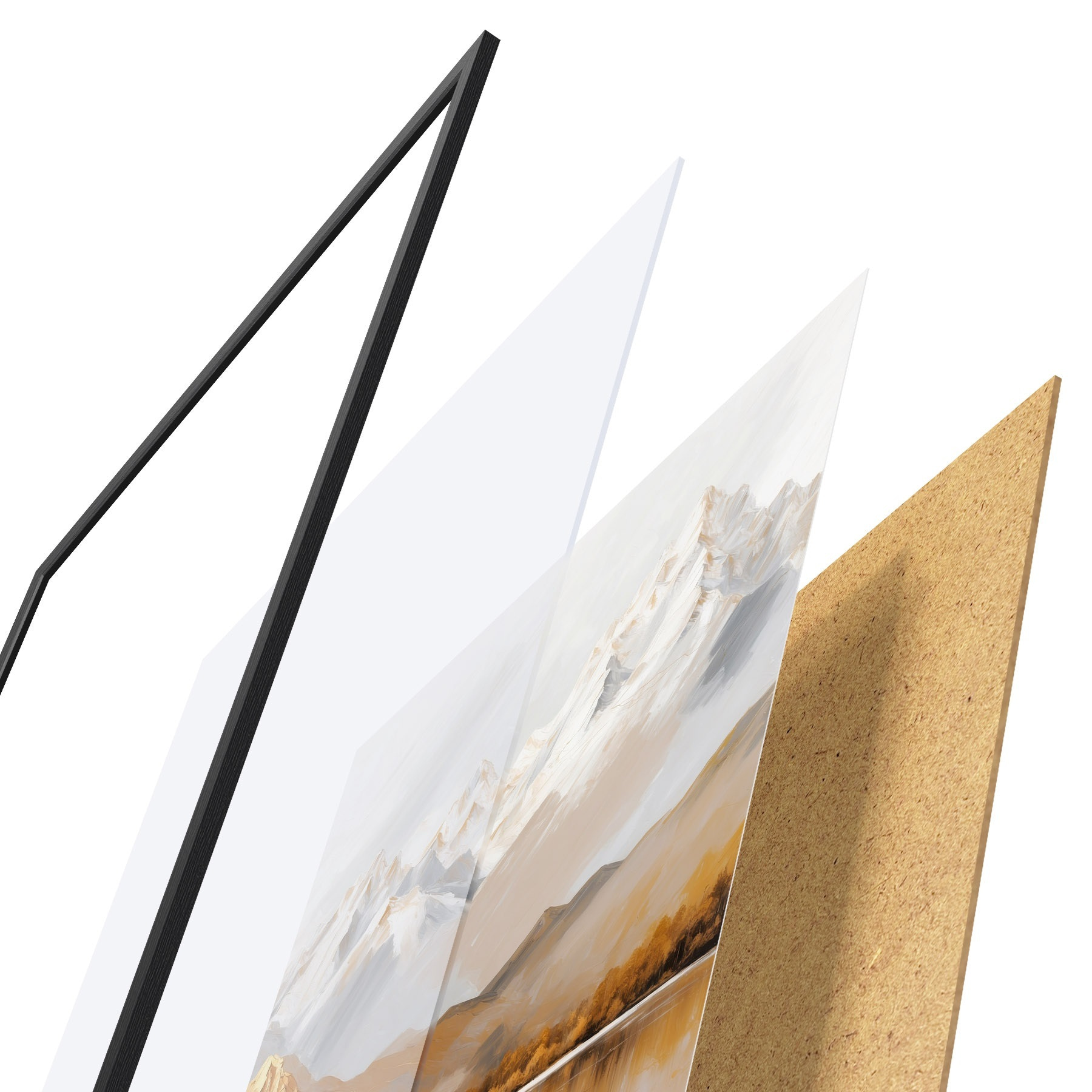 Plakát se skládá z rámu, plexiskla, tištěného obrazu a dřevotřískového podkladu. Díky úchytům na zadní straně lze plakát ihned zavěsit na zeď.