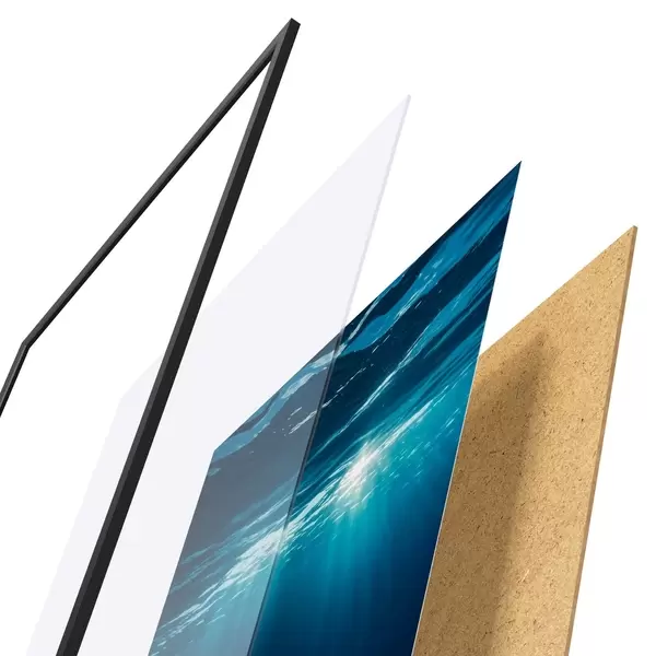 Plakát se skládá z rámu, plexiskla, tištěného obrazu a dřevotřískového podkladu. Díky úchytům na zadní straně lze plakát ihned zavěsit na zeď.