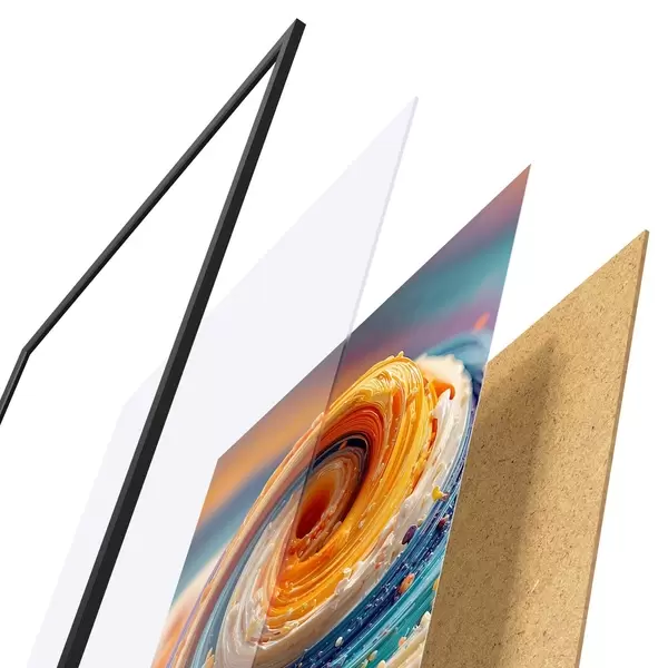 Plakát se skládá z rámu, plexiskla, tištěného obrazu a dřevotřískového podkladu. Díky úchytům na zadní straně lze plakát ihned zavěsit na zeď.