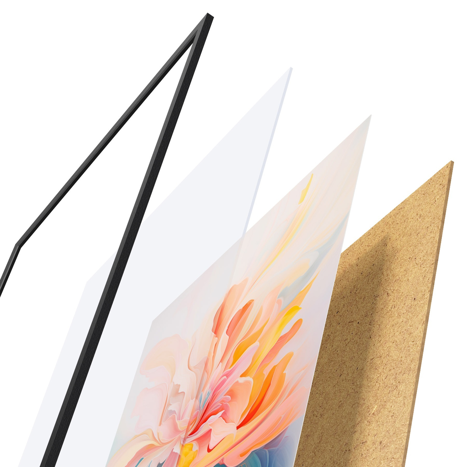 Plakát se skládá z rámu, plexiskla, tištěného obrazu a dřevotřískového podkladu. Díky úchytům na zadní straně lze plakát ihned zavěsit na zeď.