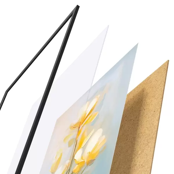 Plakát se skládá z rámu, plexiskla, tištěného obrazu a dřevotřískového podkladu. Díky úchytům na zadní straně lze plakát ihned zavěsit na zeď.