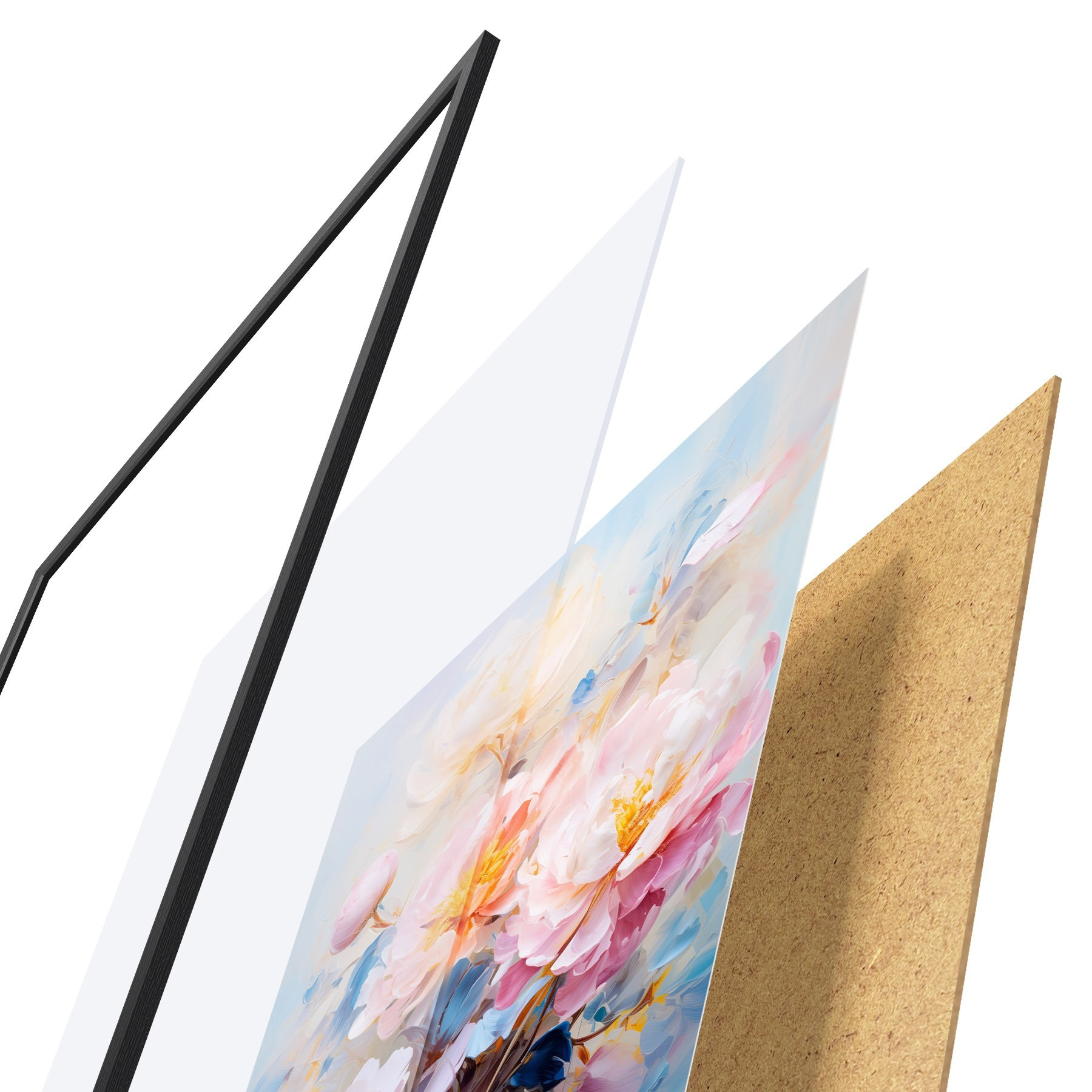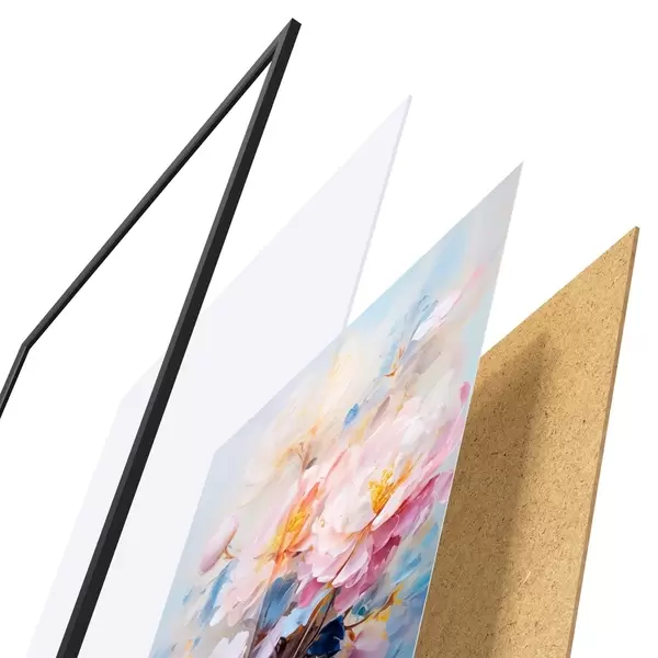 Plakát se skládá z rámu, plexiskla, tištěného obrazu a dřevotřískového podkladu. Díky úchytům na zadní straně lze plakát ihned zavěsit na zeď.