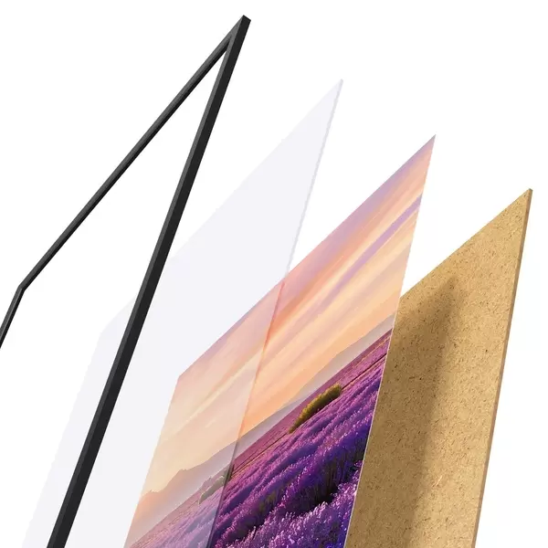 Plakát se skládá z rámu, plexiskla, tištěného obrazu a dřevotřískového podkladu. Díky úchytům na zadní straně lze plakát ihned zavěsit na zeď.