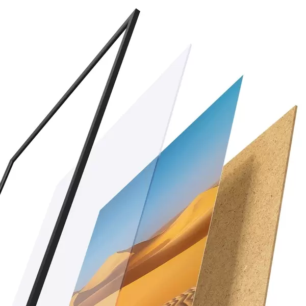 Plakát se skládá z rámu, plexiskla, tištěného obrazu a dřevotřískového podkladu. Díky úchytům na zadní straně lze plakát ihned zavěsit na zeď.