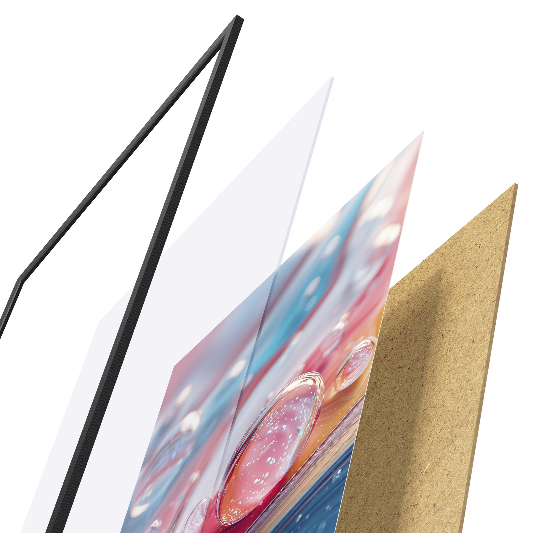 Plakát se skládá z rámu, plexiskla, tištěného obrazu a dřevotřískového podkladu. Díky úchytům na zadní straně lze plakát ihned zavěsit na zeď.