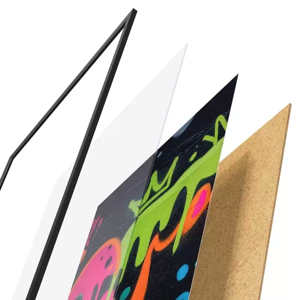 Plakát se skládá z rámu, plexiskla, tištěného obrazu a dřevotřískového podkladu. Díky úchytům na zadní straně lze plakát ihned zavěsit na zeď.