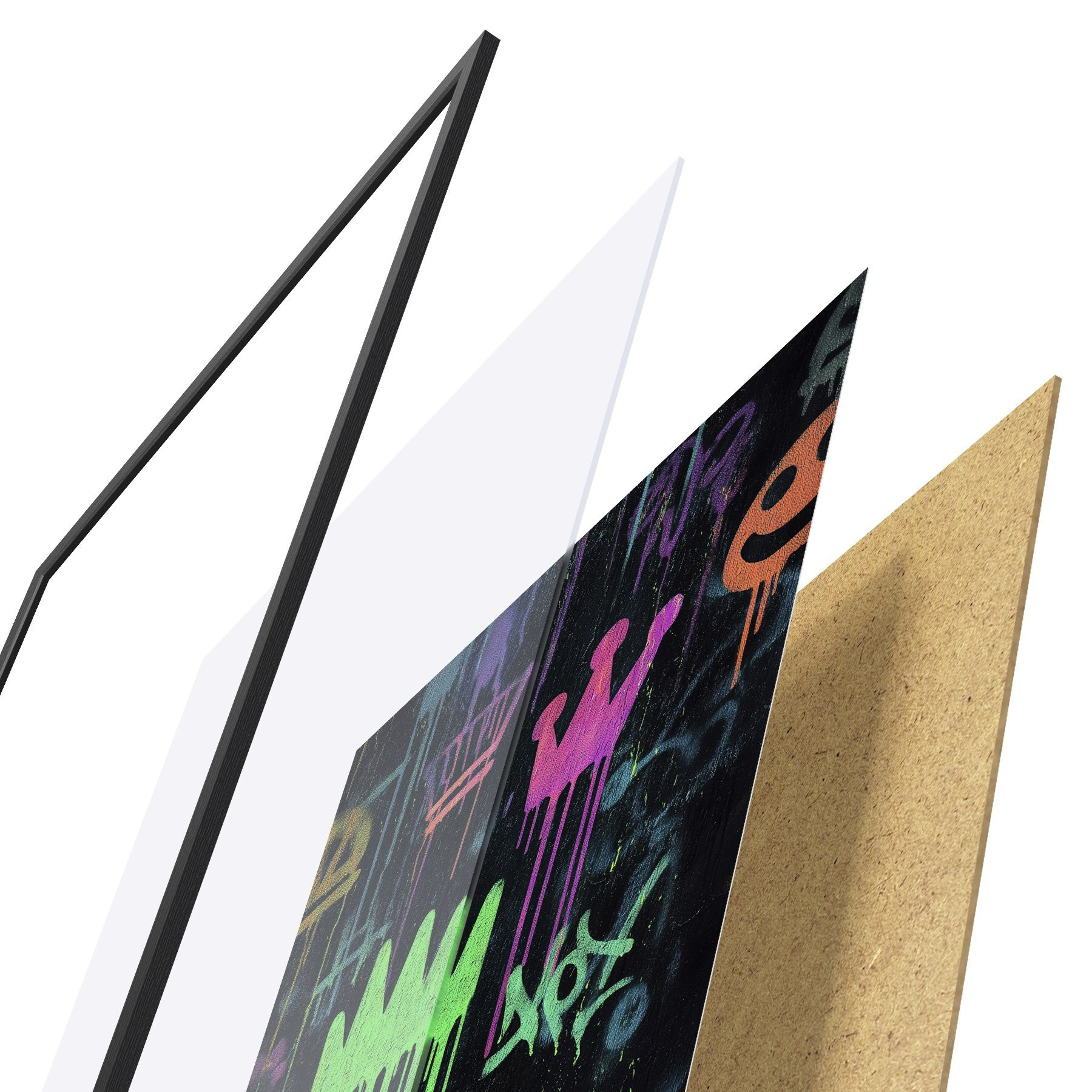 Plakát se skládá z rámu, plexiskla, tištěného obrazu a dřevotřískového podkladu. Díky úchytům na zadní straně lze plakát ihned zavěsit na zeď.