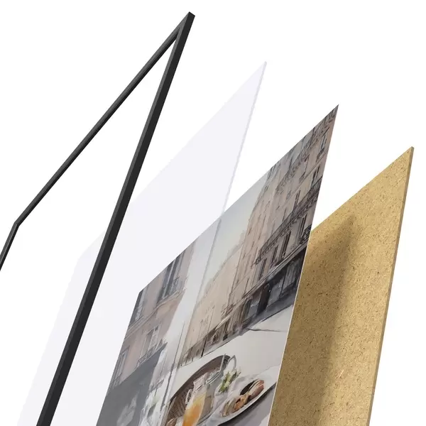 Plakát se skládá z rámu, plexiskla, tištěného obrazu a dřevotřískového podkladu. Díky úchytům na zadní straně lze plakát ihned zavěsit na zeď.