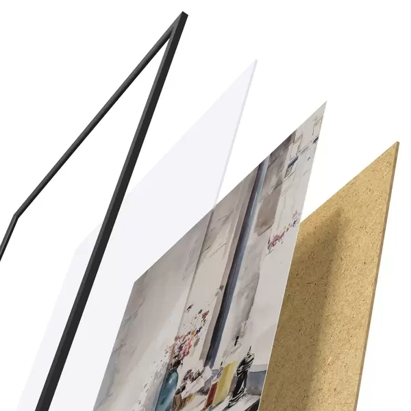 Plakát se skládá z rámu, plexiskla, tištěného obrazu a dřevotřískového podkladu. Díky úchytům na zadní straně lze plakát ihned zavěsit na zeď.