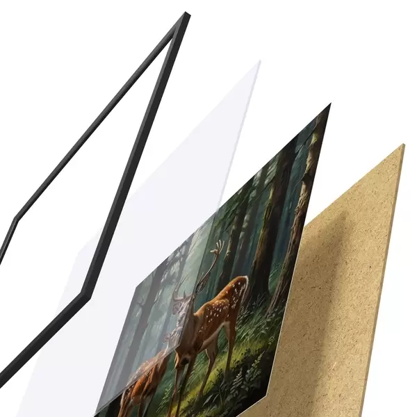 Plakát se skládá z rámu, plexiskla, tištěného obrazu a dřevotřískového podkladu. Díky úchytům na zadní straně lze plakát ihned zavěsit na zeď.