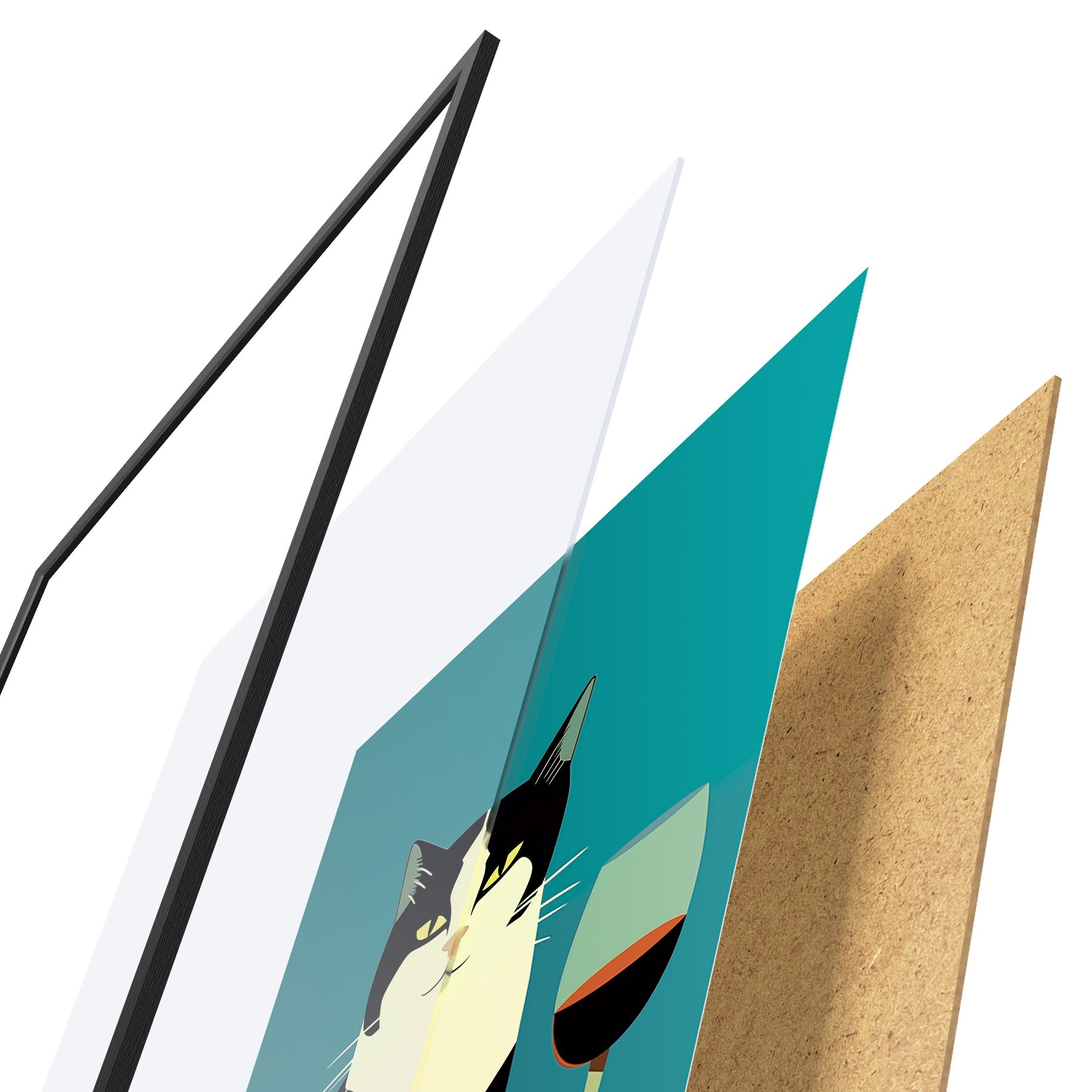 Plakát se skládá z rámu, plexiskla, tištěného obrazu a dřevotřískového podkladu. Díky úchytům na zadní straně lze plakát ihned zavěsit na zeď.