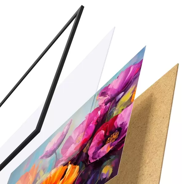 Plakát se skládá z rámu, plexiskla, tištěného obrazu a dřevotřískového podkladu. Díky úchytům na zadní straně lze plakát ihned zavěsit na zeď.