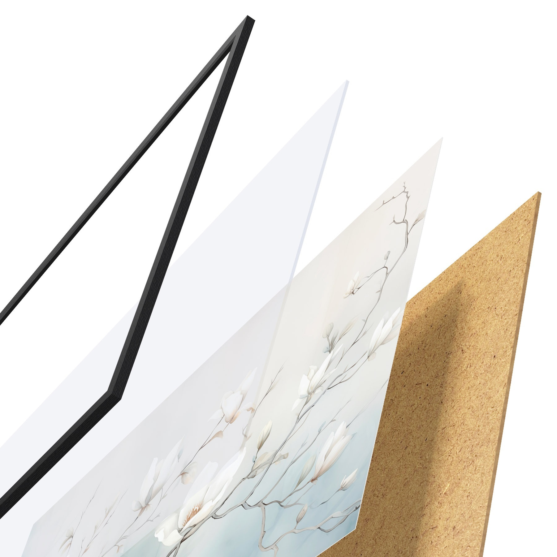 Plakát se skládá z rámu, plexiskla, tištěného obrazu a dřevotřískového podkladu. Díky úchytům na zadní straně lze plakát ihned zavěsit na zeď.