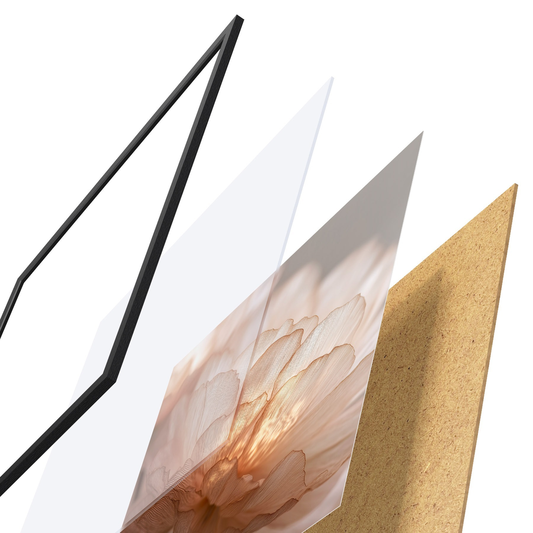 Plakát se skládá z rámu, plexiskla, tištěného obrazu a dřevotřískového podkladu. Díky úchytům na zadní straně lze plakát ihned zavěsit na zeď.