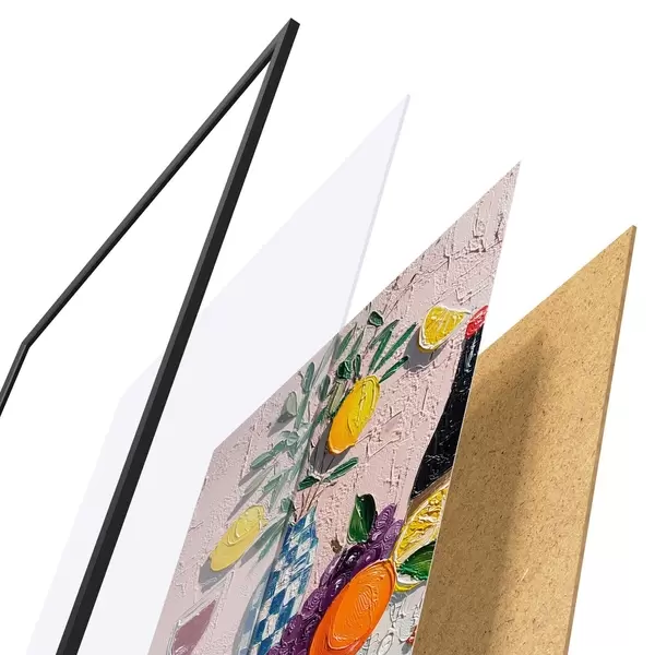 Plakát se skládá z rámu, plexiskla, tištěného obrazu a dřevotřískového podkladu. Díky úchytům na zadní straně lze plakát ihned zavěsit na zeď.