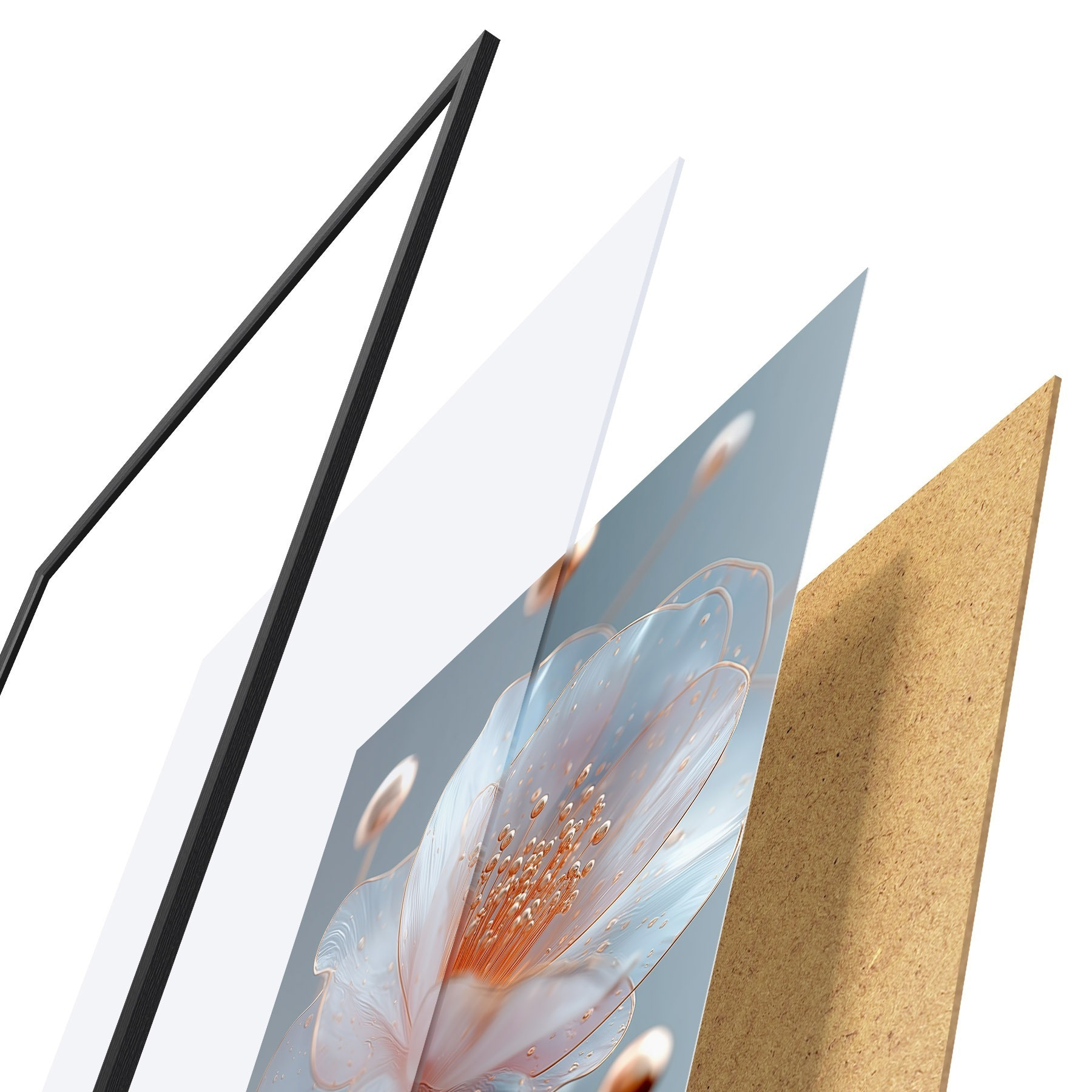 Plakát se skládá z rámu, plexiskla, tištěného obrazu a dřevotřískového podkladu. Díky úchytům na zadní straně lze plakát ihned zavěsit na zeď.