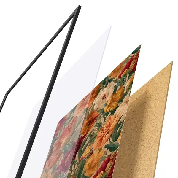 Plakát se skládá z rámu, plexiskla, tištěného obrazu a dřevotřískového podkladu. Díky úchytům na zadní straně lze plakát ihned zavěsit na zeď.