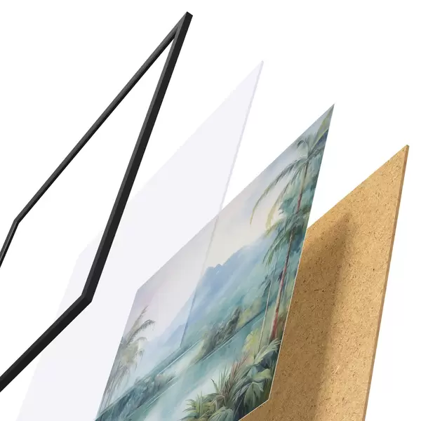 Plakát se skládá z rámu, plexiskla, tištěného obrazu a dřevotřískového podkladu. Díky úchytům na zadní straně lze plakát ihned zavěsit na zeď.