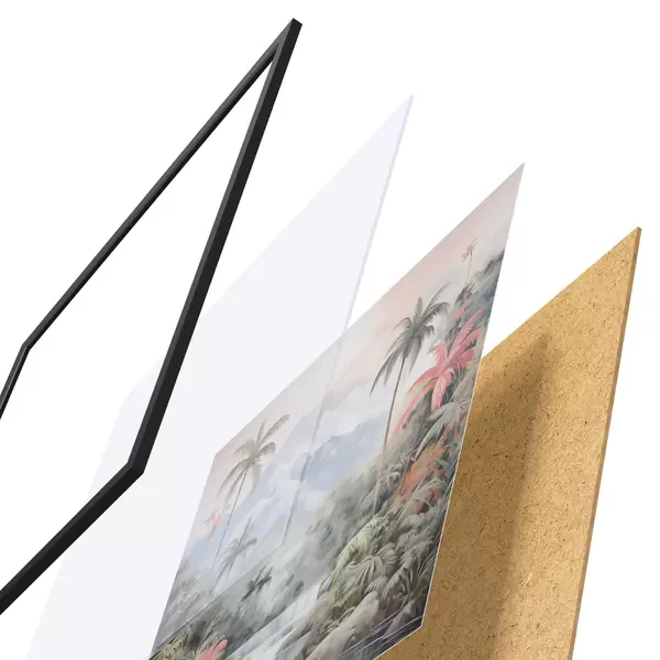 Plakát se skládá z rámu, plexiskla, tištěného obrazu a dřevotřískového podkladu. Díky úchytům na zadní straně lze plakát ihned zavěsit na zeď.