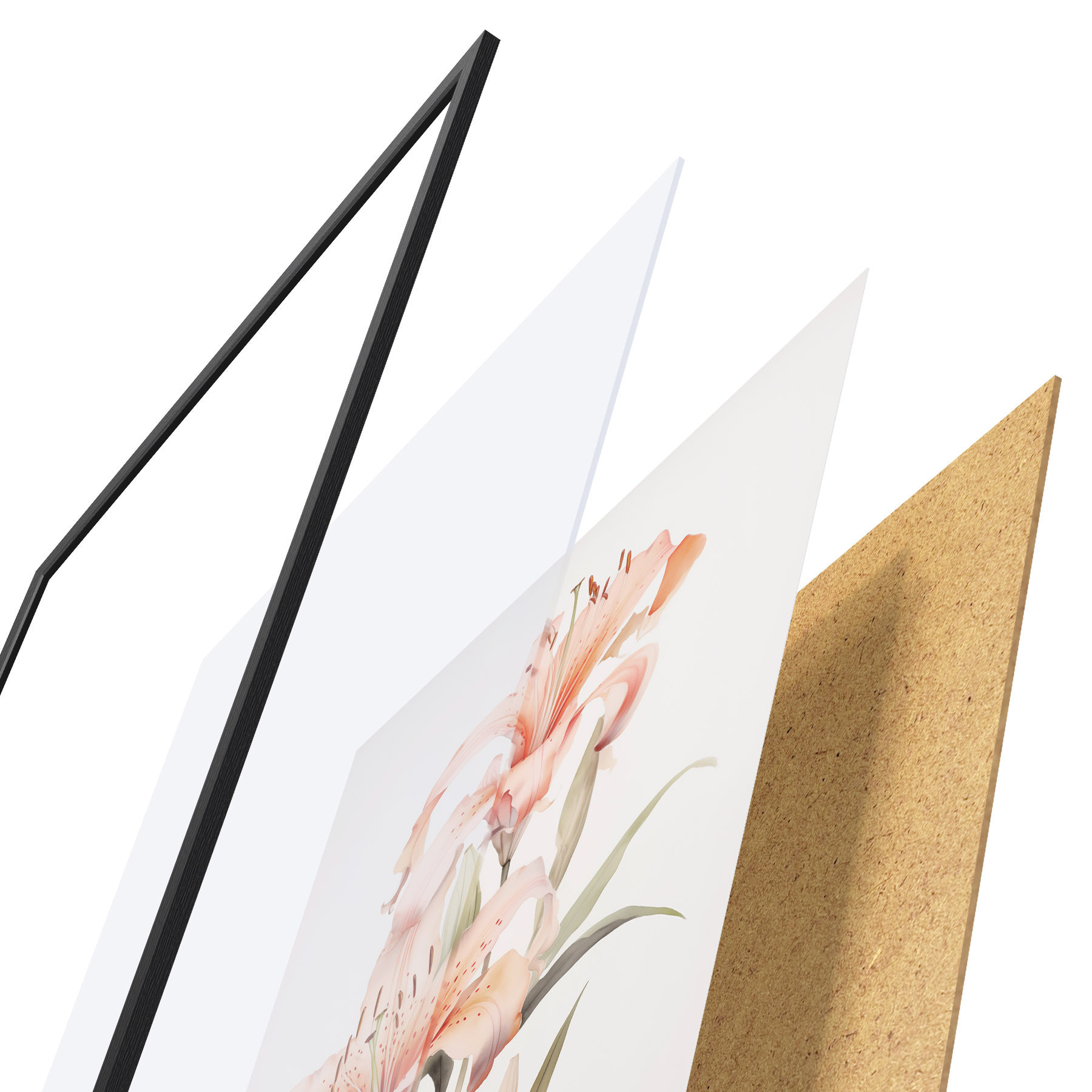 Plakát se skládá z rámu, plexiskla, tištěného obrazu a dřevotřískového podkladu. Díky úchytům na zadní straně lze plakát ihned zavěsit na zeď.
