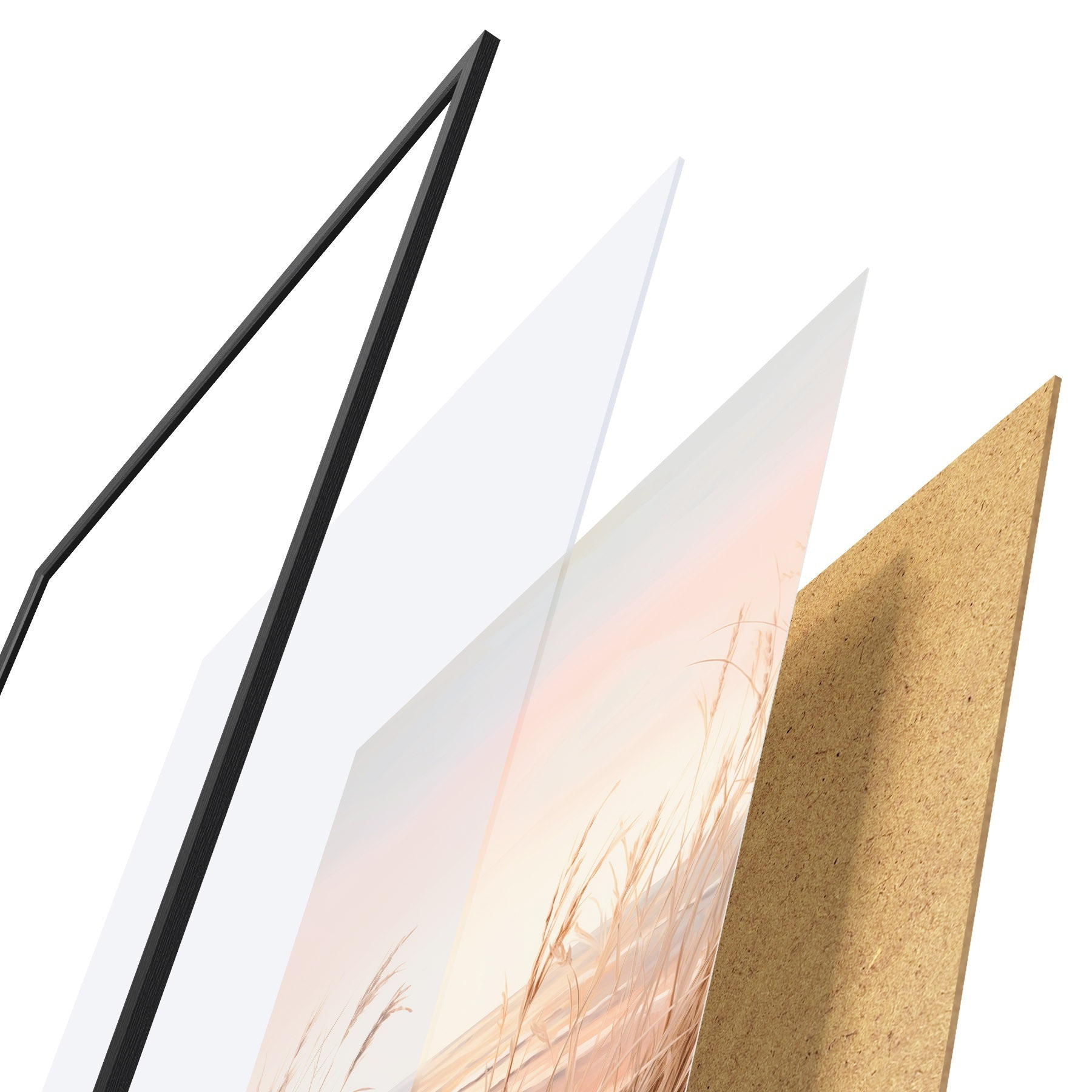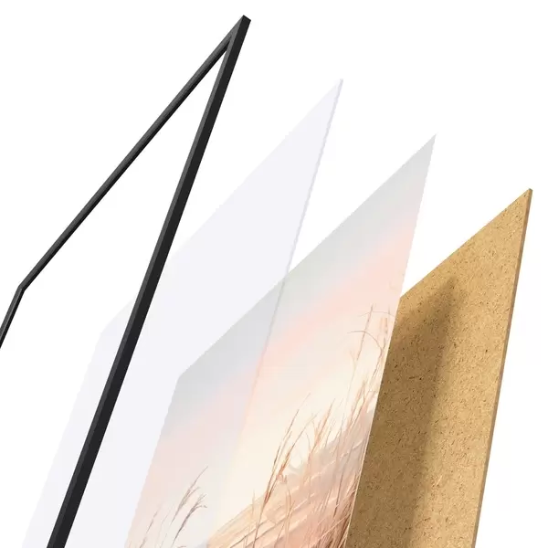 Plakát se skládá z rámu, plexiskla, tištěného obrazu a dřevotřískového podkladu. Díky úchytům na zadní straně lze plakát ihned zavěsit na zeď.