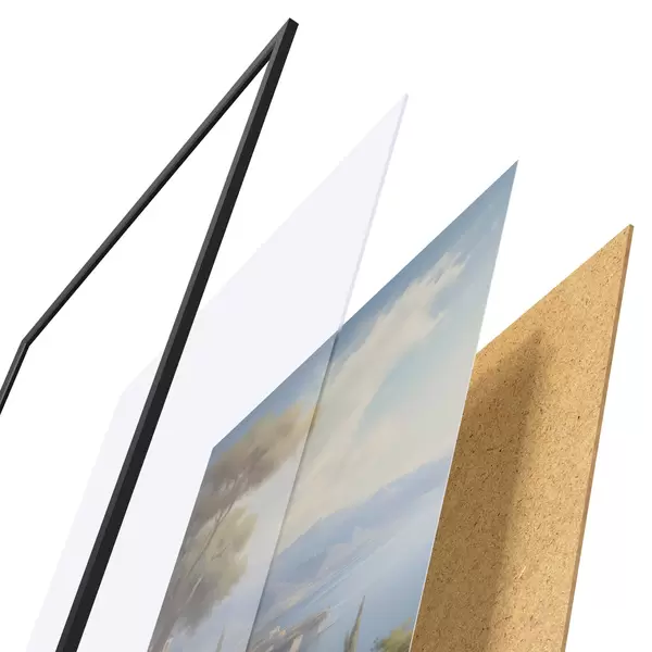 Plakát se skládá z rámu, plexiskla, tištěného obrazu a dřevotřískového podkladu. Díky úchytům na zadní straně lze plakát ihned zavěsit na zeď.