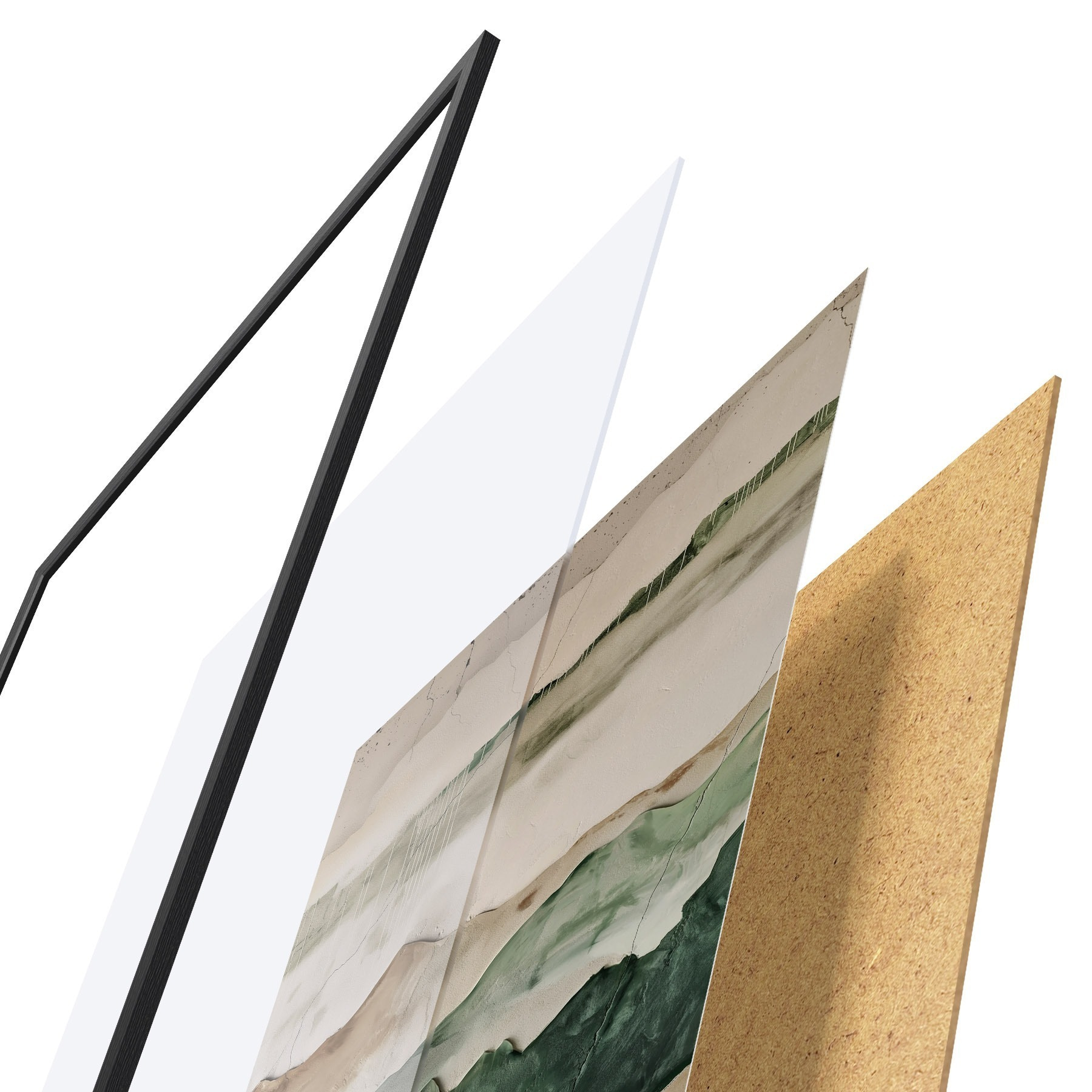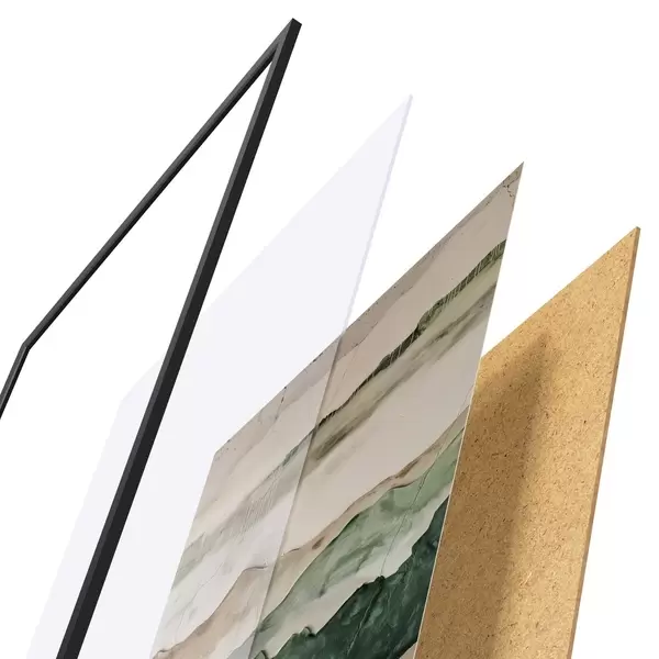 Plakát se skládá z rámu, plexiskla, tištěného obrazu a dřevotřískového podkladu. Díky úchytům na zadní straně lze plakát ihned zavěsit na zeď.