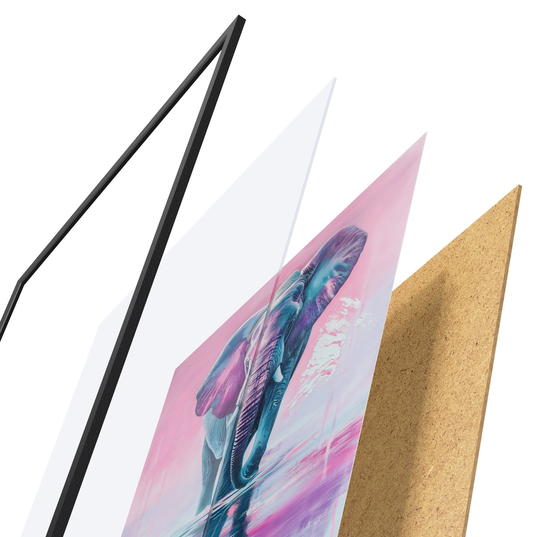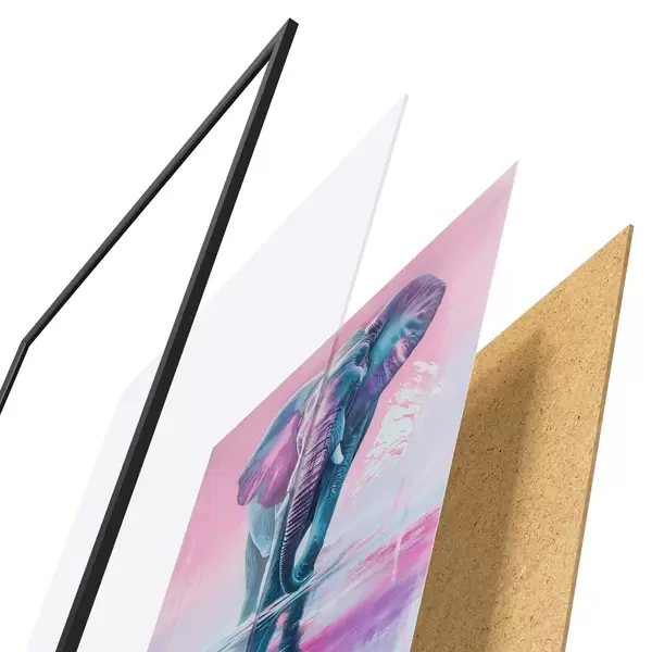Plakát se skládá z rámu, plexiskla, tištěného obrazu a dřevotřískového podkladu. Díky úchytům na zadní straně lze plakát ihned zavěsit na zeď.