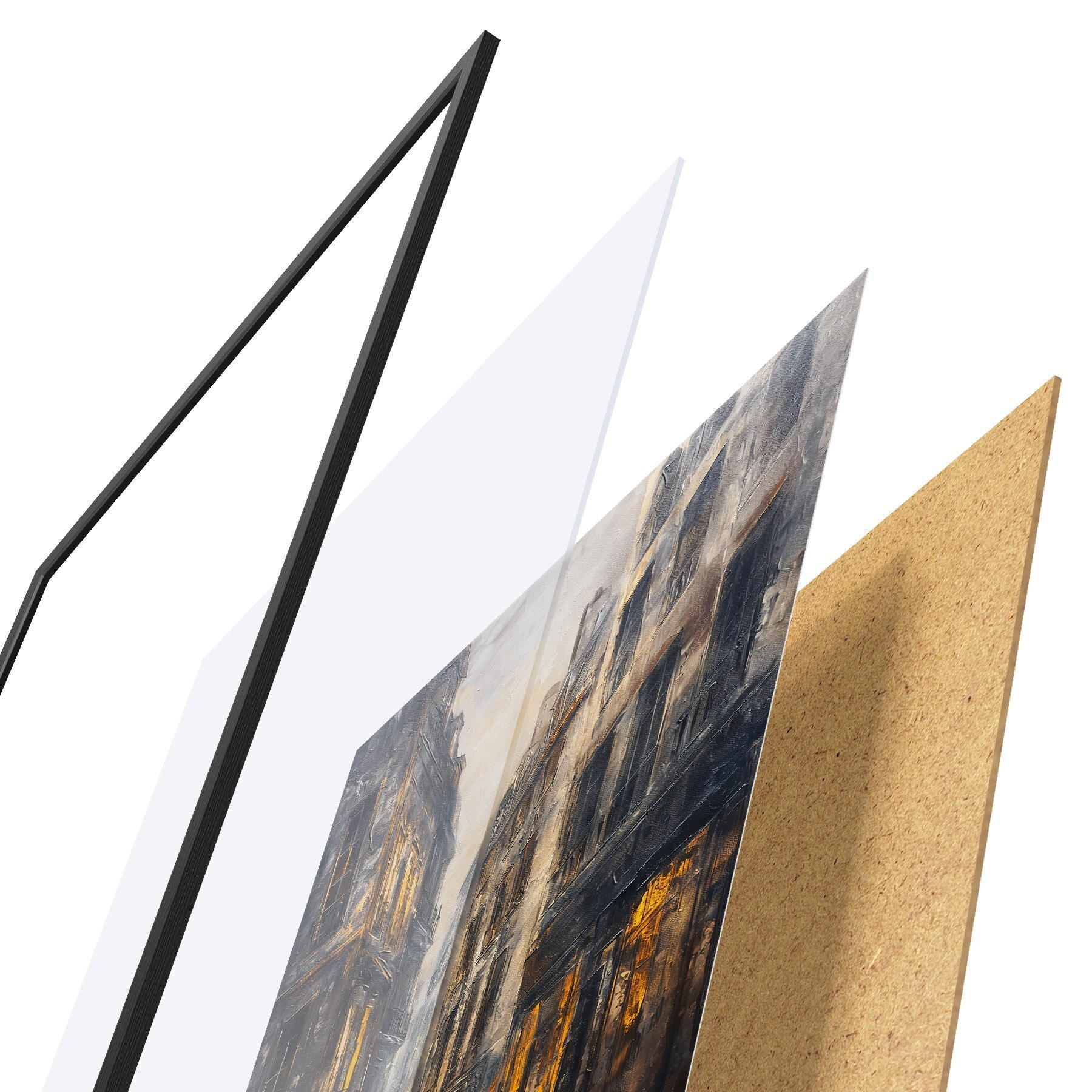 Plakát se skládá z rámu, plexiskla, tištěného obrazu a dřevotřískového podkladu. Díky úchytům na zadní straně lze plakát ihned zavěsit na zeď.