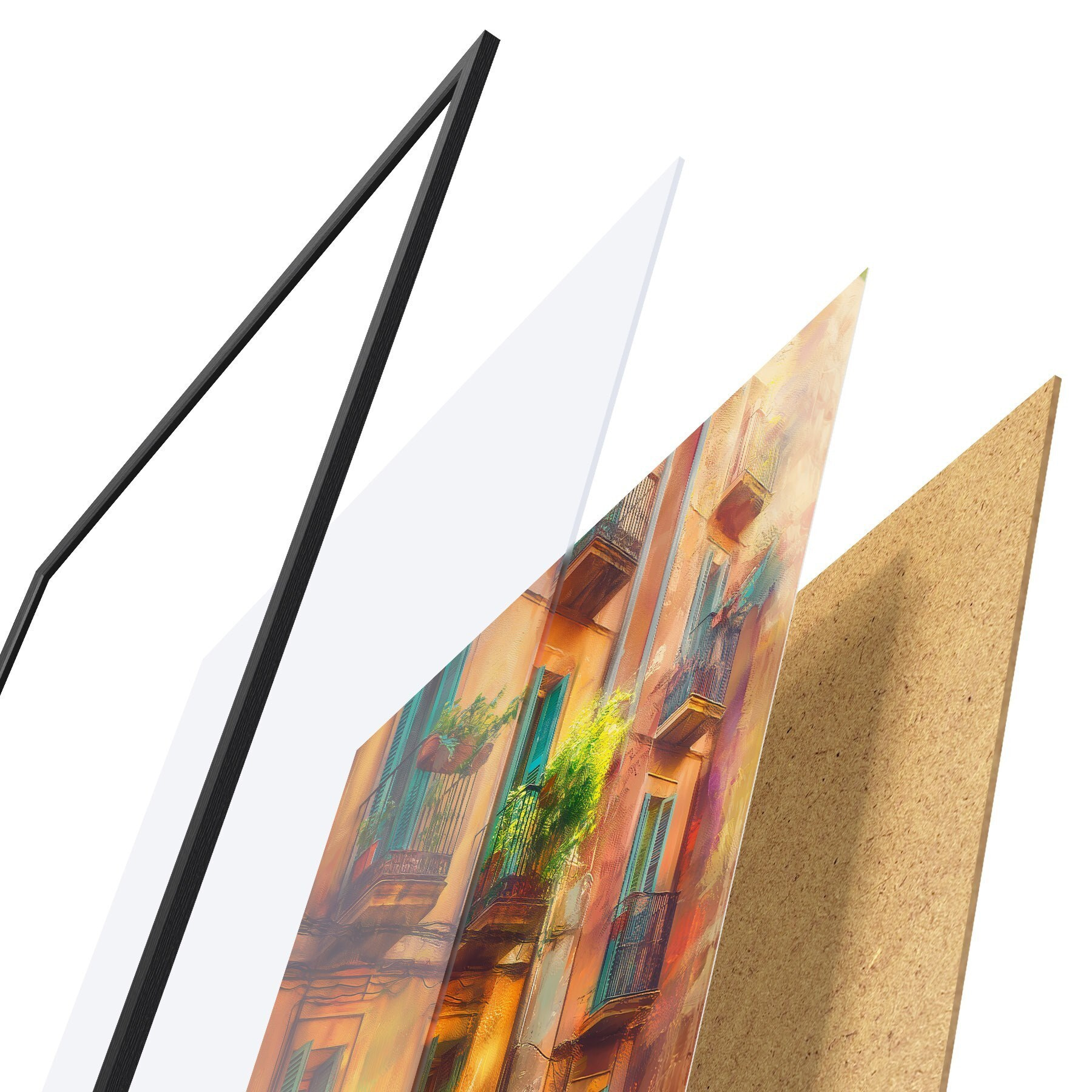 Plakát se skládá z rámu, plexiskla, tištěného obrazu a dřevotřískového podkladu. Díky úchytům na zadní straně lze plakát ihned zavěsit na zeď.