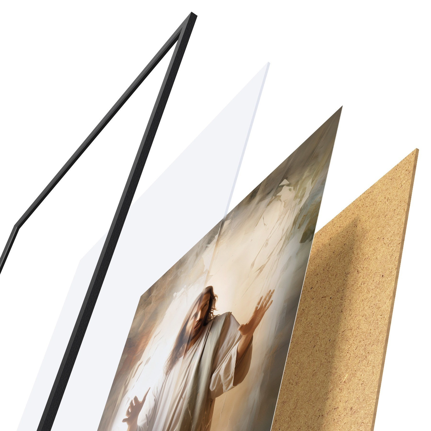Plakát se skládá z rámu, plexiskla, tištěného obrazu a dřevotřískového podkladu. Díky úchytům na zadní straně lze plakát ihned zavěsit na zeď.