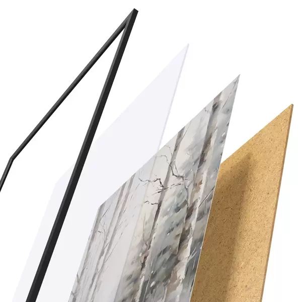 Plakát se skládá z rámu, plexiskla, tištěného obrazu a dřevotřískového podkladu. Díky úchytům na zadní straně lze plakát ihned zavěsit na zeď.