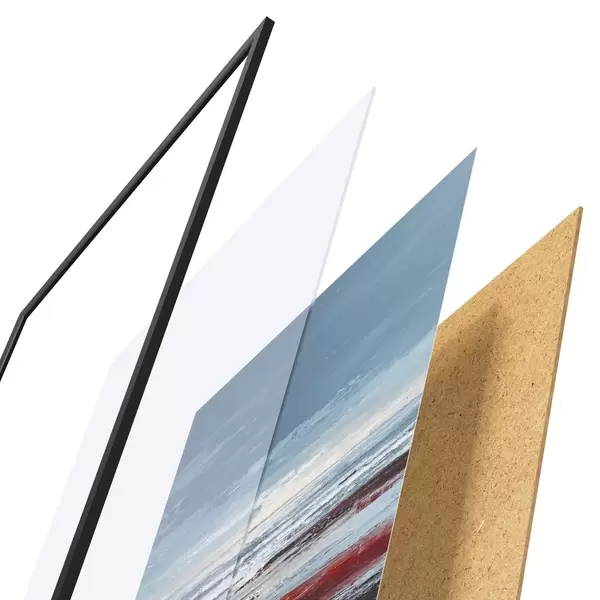 Plakát se skládá z rámu, plexiskla, tištěného obrazu a dřevotřískového podkladu. Díky úchytům na zadní straně lze plakát ihned zavěsit na zeď.