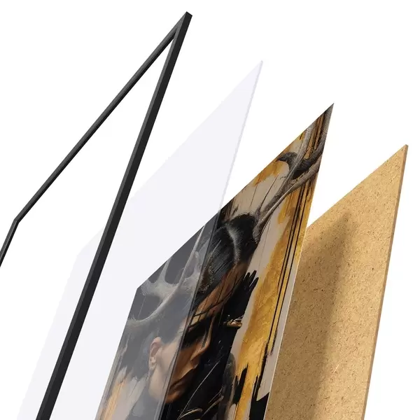 Plakát se skládá z rámu, plexiskla, tištěného obrazu a dřevotřískového podkladu. Díky úchytům na zadní straně lze plakát ihned zavěsit na zeď.