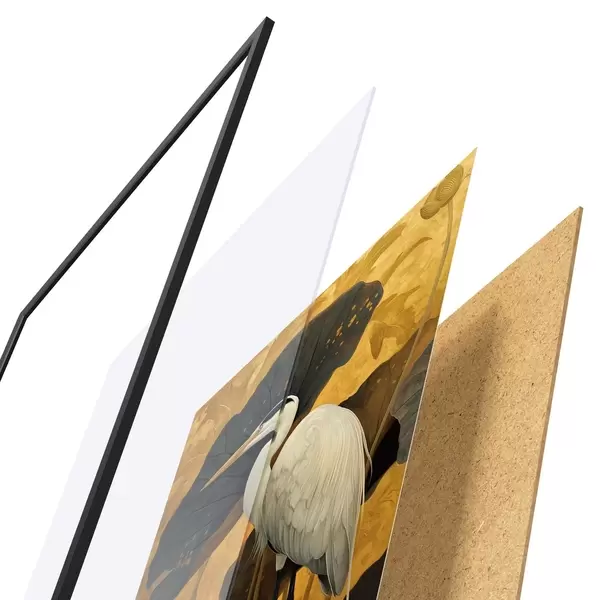 Plakát se skládá z rámu, plexiskla, tištěného obrazu a dřevotřískového podkladu. Díky úchytům na zadní straně lze plakát ihned zavěsit na zeď.