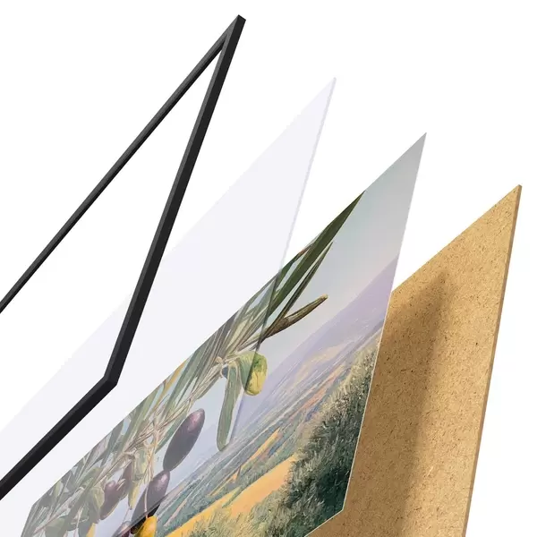 Plakát se skládá z rámu, plexiskla, tištěného obrazu a dřevotřískového podkladu. Díky úchytům na zadní straně lze plakát ihned zavěsit na zeď.