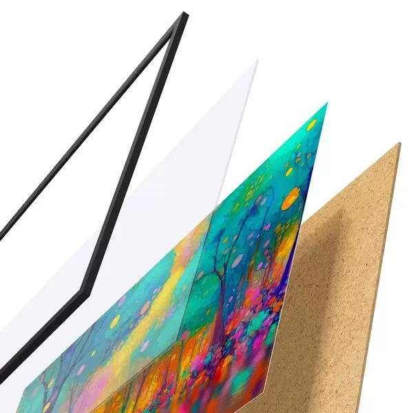 Plakát se skládá z rámu, plexiskla, tištěného obrazu a dřevotřískového podkladu. Díky úchytům na zadní straně lze plakát ihned zavěsit na zeď.